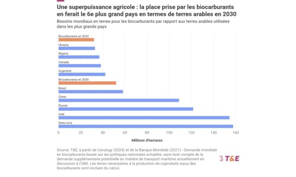 Car T&E montre comment les biocarburants sont appelés à se développer via de multiples nouvelles utilisations imposées par les législations. « C’est par exemple le cas des navires, bientôt contraints à se fournir en carburants alternatifs par l’Organisation maritime internationale, qui signera courant octobre le tout premier accord international en la matière. De quoi créer un appel d’air sans précédent pour les biocarburants à base de matières agricoles. Ils sont aussi utilisés par la filière des poids-lourds en France, et présentés comme une « solution » alternative à l’électrification des voitures par certains acteurs de la filière ».