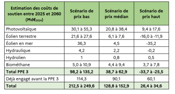 Pour ce qui est du coût direct d’une politique favorable aux renouvelables intermittents, Henri Wallard explique qu’« avec les capacités programmées et le prix de référence de l’électricité raisonnable (50 euros par MWh) qui est un des scénarios de la DGEC [Direction générale de l’énergie et du climat] et aussi le prix 2026 retenu par la CRE qui est de 50,88 €/MWh en se fondant sur les documents de la consultation de 2025, les coûts futurs de soutien aux EnR sont d’ici 2060 de 114,3 milliards d’euros pour les projets déjà engagés et 98,2 milliards d’euros pour les nouveaux projets annoncés par la PPE3 ».