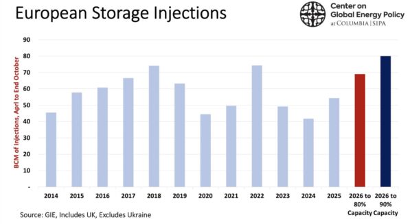 Besoins de gaz de l’Europe pour reconstituer ses réserves, en milliards de mètres cubes (BCM). Deux hypothèses, réserves reconstituées à 80% en rouge et réserves reconstituées à 90% en bleu foncé. Source Center on Global Energy Policy.