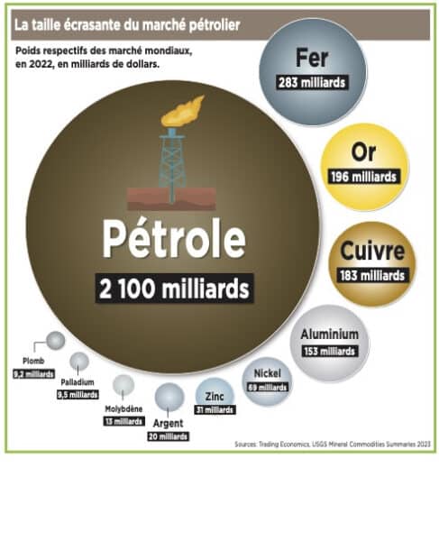 La crise énergétique née de la guerre américano-israélienne contre la République islamique d’Iran transforme en profondeur le marché pétrolier mondial. Cela est passé plutôt inaperçu jusqu’à aujourd’hui et pourrait avoir de lourdes conséquences sur la durée. Rappelons que la taille du marché pétrolier mondial est sans commune mesure avec celle de toutes les autres matières premières, énergétiques ou pas. L’an dernier, le marché pétrolier mondial représentait plus de 3 000 milliards de dollars. Pour donner un ordre d’idée, la valeur du marché mondial du charbon était, toujours en 2025, de 1 600 milliards de dollars et celle du gaz naturel de 900 milliards de dollars. Et la différence avec les autres matières premières est encore plus spectaculaire comme le montre l’infographie ci-dessous avec des chiffres de 2022.