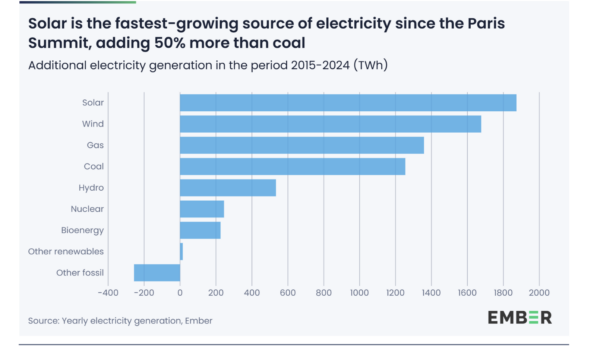 Capacités de production électrique ajoutés entre 2015 et 2024 en TWh. Source : Ember.