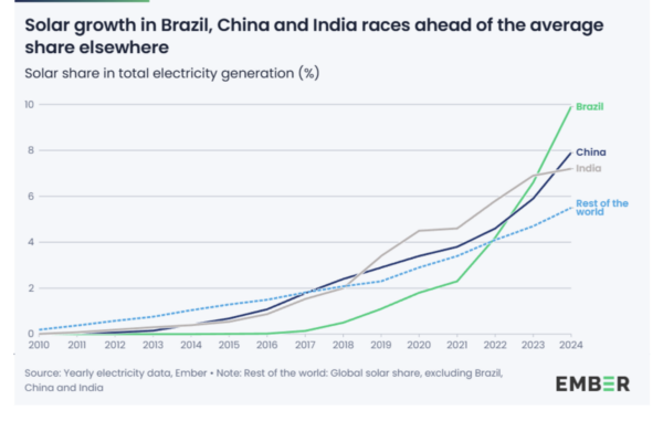 Ensemble ces trois pays dont les deux plus peuplés au monde représentent 60% de la nouvelle capacité solaire totale, soit environ 1 TW ajouté dans le monde depuis 2015. Au cours des trois premiers trimestres de 2025, ces trois pays ont atteint environ un dixième de leur électricité produite par du solaire : 12% au Brésil, 11% en Chine et près de 9% en Inde.